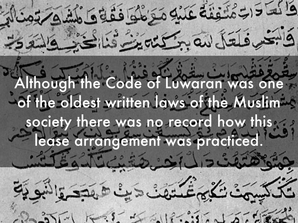 Although the Code of Luwaran was one of the oldest written laws of the Muslim society there was no record how this lease arrangement was practiced.