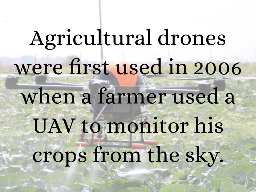 Agricultural drones were first used in 2006 when a farmer used a UAV to monitor his crops from the sky.