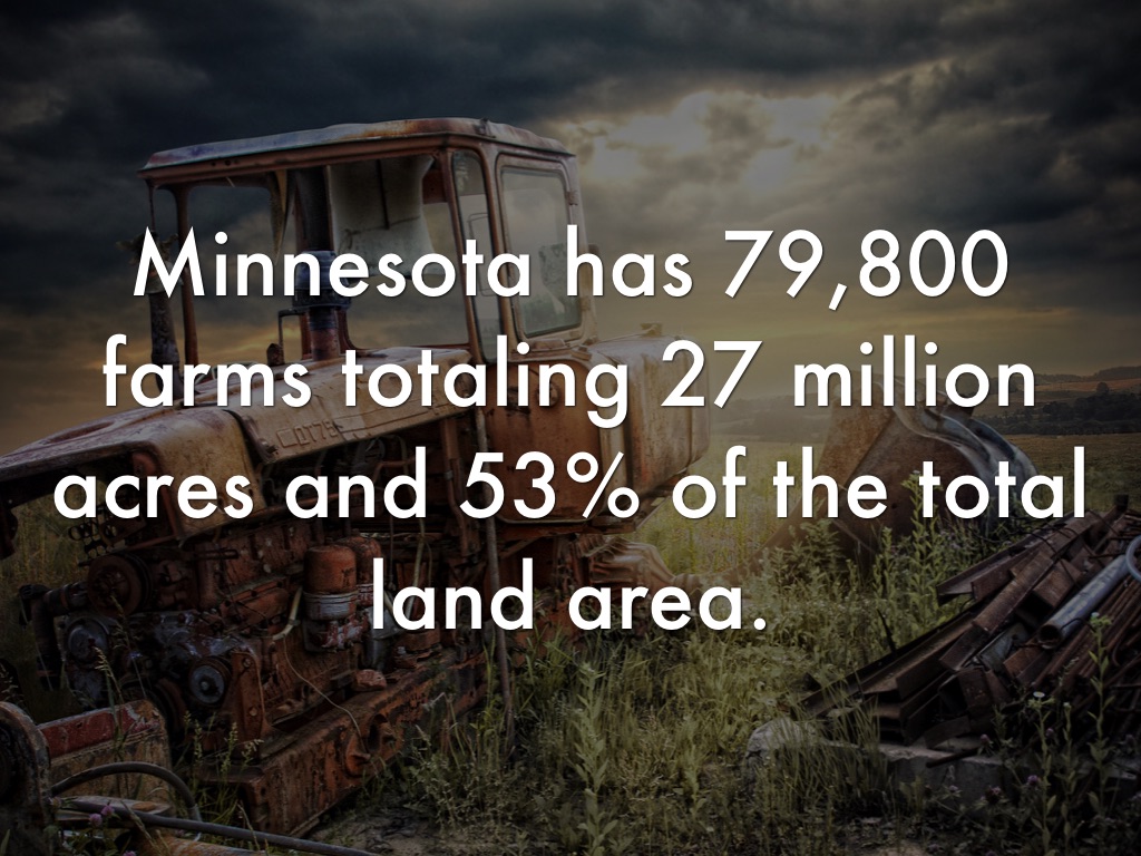 Minnesota has 79,800 farms totaling 27 million acres and 53% of the total land area.