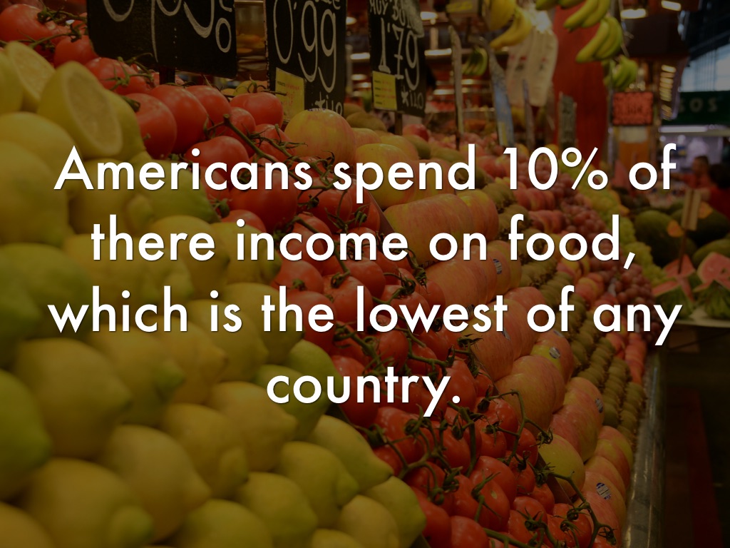Americans spend 10% of there income on food, which is the lowest of any country.