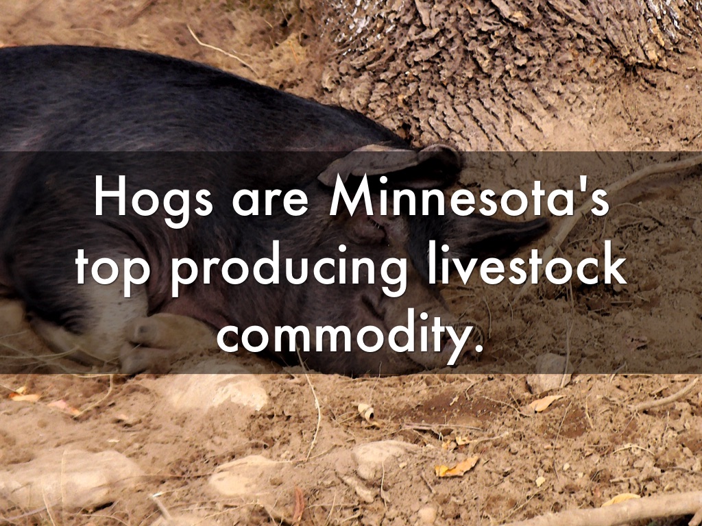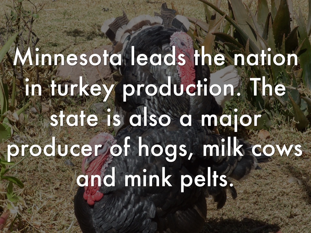 Minnesota leads the nation in turkey production. The state is also a major producer of hogs, milk cows and mink pelts.