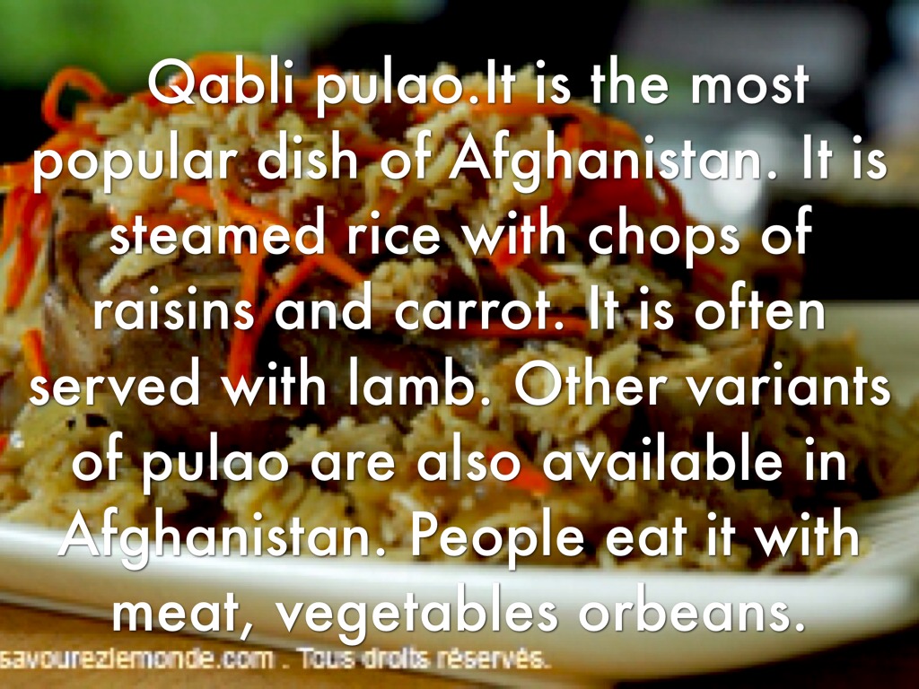 Qabli pulao.It is the most popular dish of Afghanistan. It is steamed rice with chops of raisins and carrot. It is often served with lamb. Other variants of pulao are also available in Afghanistan. People eat it with meat, vegetables orbeans.