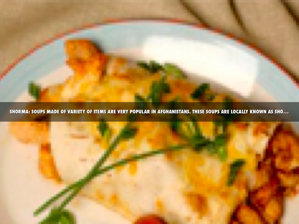 Shorma: Soups made of variety of items are very popular in Afghanistans. These soups are locally known as shorma.