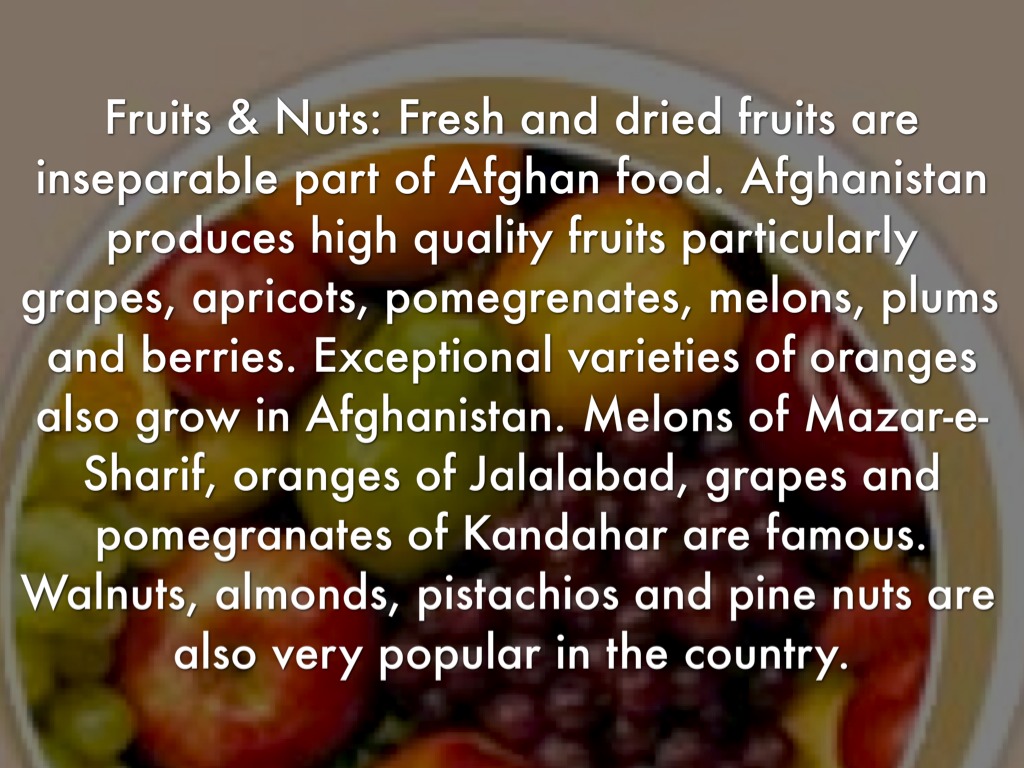 Fruits & Nuts: Fresh and dried fruits are inseparable part of Afghan food. Afghanistan produces high quality fruits particularly grapes, apricots, pomegrenates, melons, plums and berries. Exceptional varieties of oranges also grow in Afghanistan. Melons of Mazar-e-Sharif, oranges of Jalalabad, grapes and pomegranates of Kandahar are famous. Walnuts, almonds, pistachios and pine nuts are also very popular in the country.