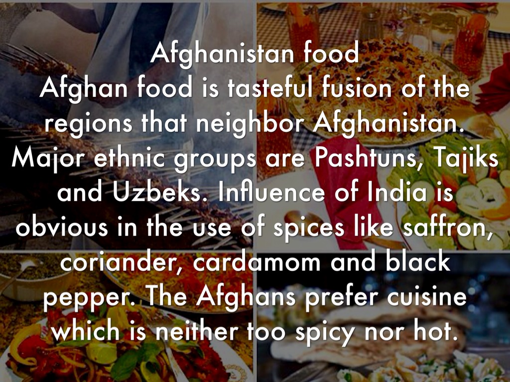 Afghan food is tasteful fusion of the regions that neighbor Afghanistan. Major ethnic groups are Pashtuns, Tajiks and Uzbeks. Influence of India is obvious in the use of spices like saffron, coriander, cardamom and black pepper. The Afghans prefer cuisine which is neither too spicy nor hot.