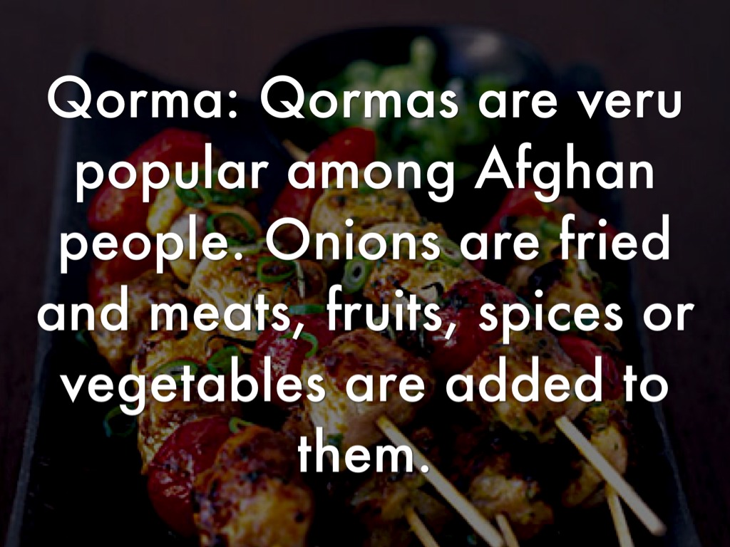 Qorma: Qormas are veru popular among Afghan people. Onions are fried and meats, fruits, spices or vegetables are added to them.
