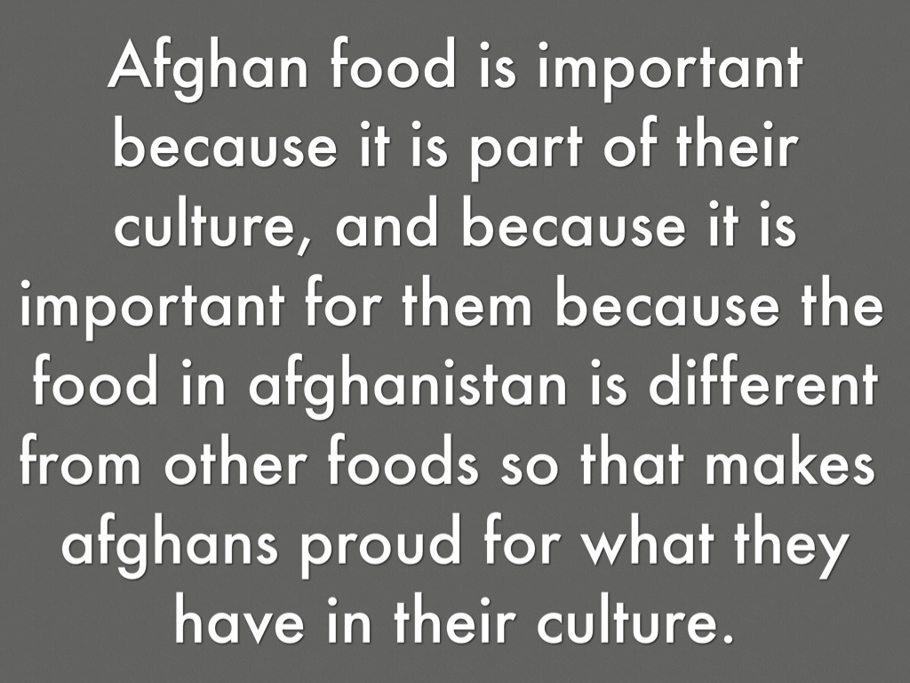 Afghan food is important because it is part of their culture, and because it is important for them because the food in afghanistan is different from other foods so that makes afghans proud for what they have in their culture.