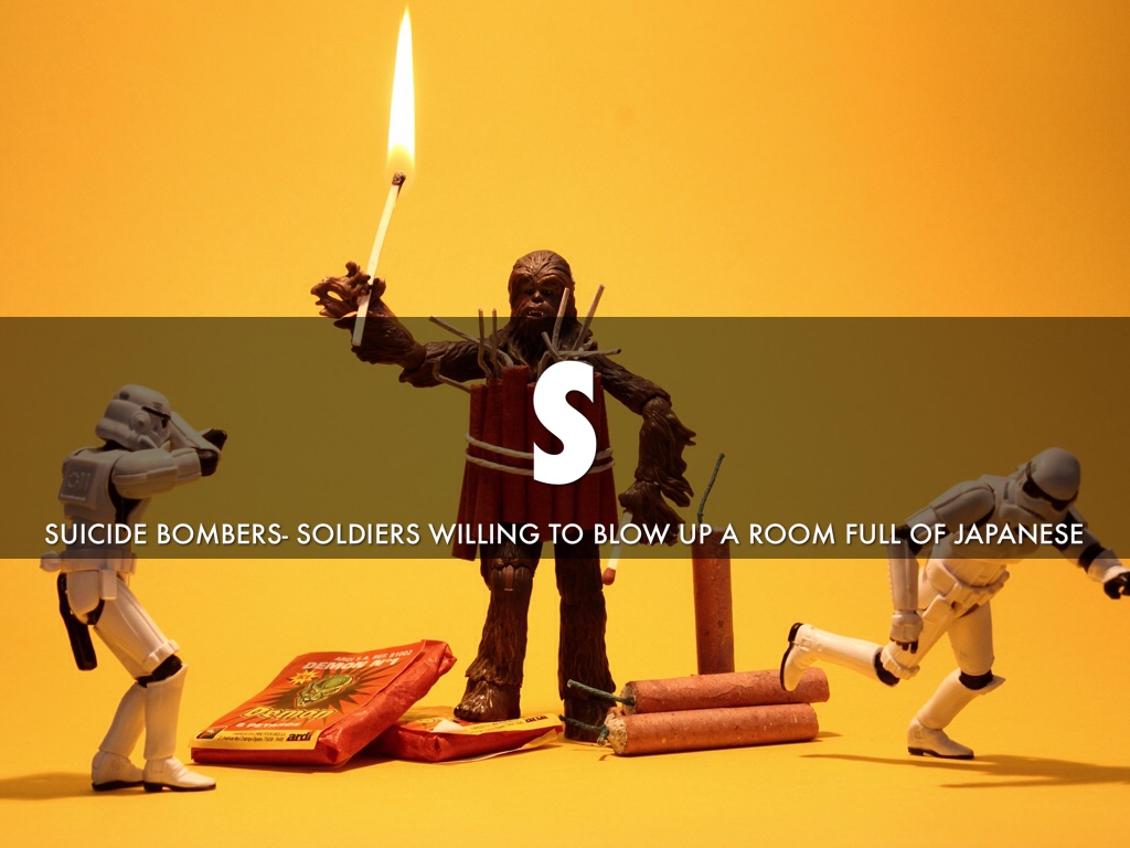 SUICIDE BOMBERS- SOLDIERS WILLING TO BLOW UP A ROOM FULL OF JAPANESE