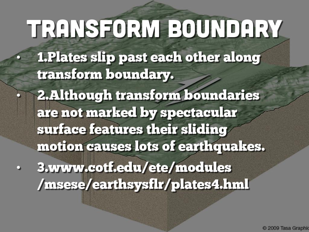 2.Although transform boundaries are not marked by spectacular surface features their sliding motion causes lots of earthquakes.
