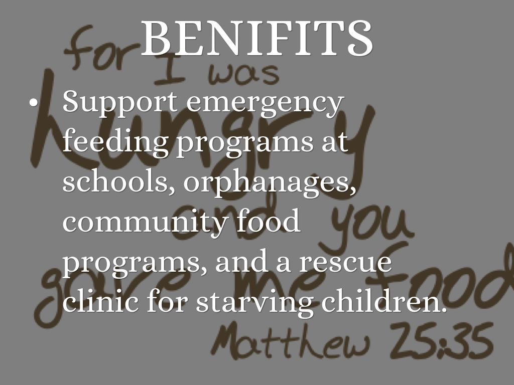 Support emergency feeding programs at schools, orphanages, community food programs, and a rescue clinic for starving children.