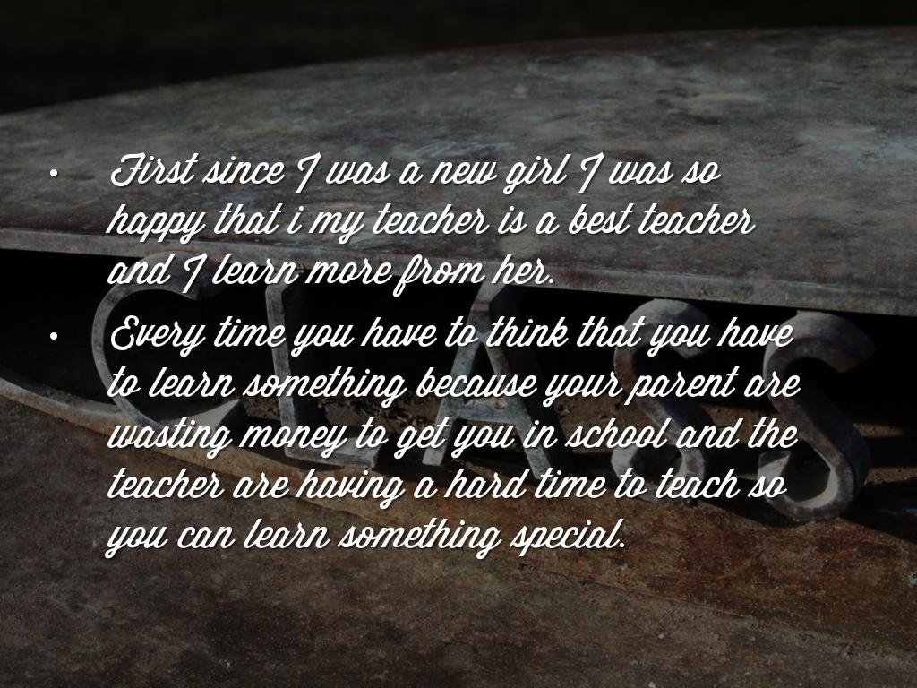 First since I was a new girl I was so happy that i my teacher is a best teacher and I learn more from her.