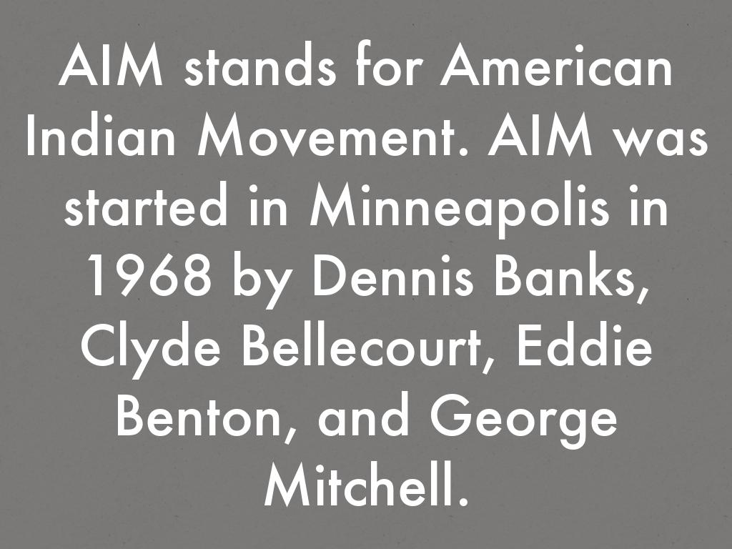 AIM stands for American Indian Movement. AIM was started in Minneapolis in 1968 by Dennis Banks, Clyde Bellecourt, Eddie Benton, and George Mitchell.