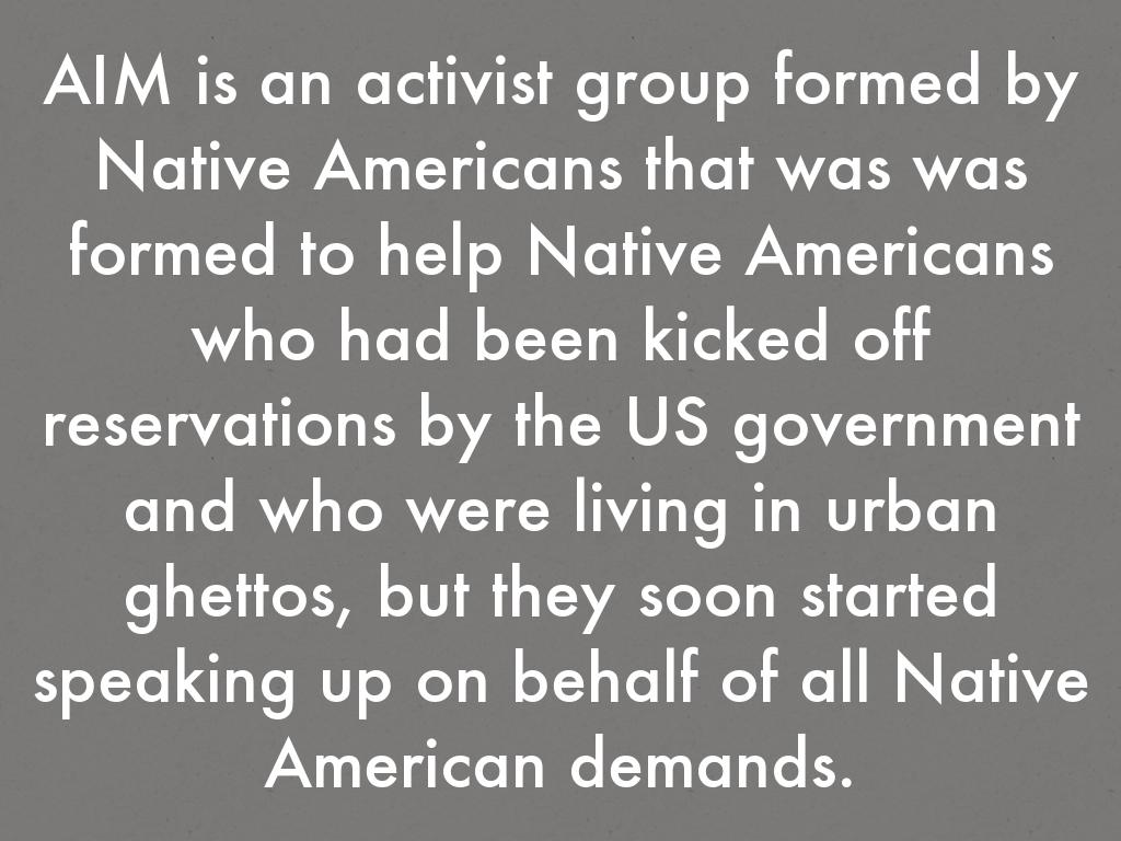 AIM is an activist group formed by Native Americans that was was formed to help Native Americans who had been kicked off reservations by the US government and who were living in urban ghettos, but they soon started speaking up on behalf of all Native American demands.