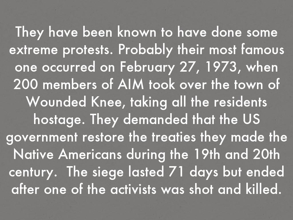 They have been known to have done some extreme protests. Probably their most famous one occurred on February 27, 1973, when 200 members of AIM took over the town of Wounded Knee, taking all the residents hostage. They demanded that the US government restore the treaties they made tp the Native Americans during the 19th and 20th century. The siege lasted 71 days but ended after one of the activists was shot and killed.