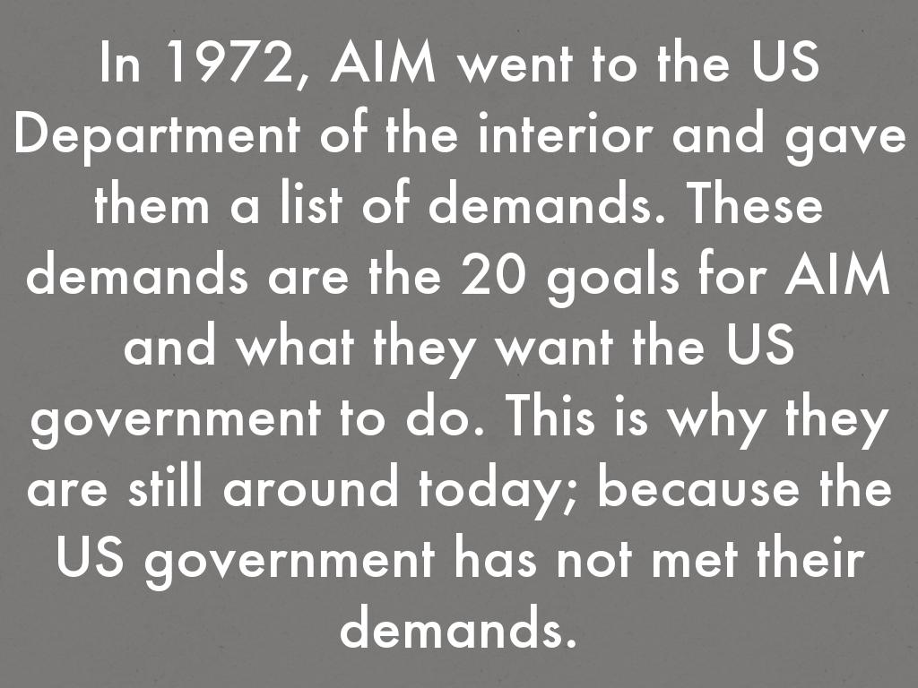 In 1972, AIM went to the US Department of the interior and gave them a list of demands. These demands are the 20 goals for AIM and what they want the US government to do. This is why they are still around today; because the US government has not met their demands.