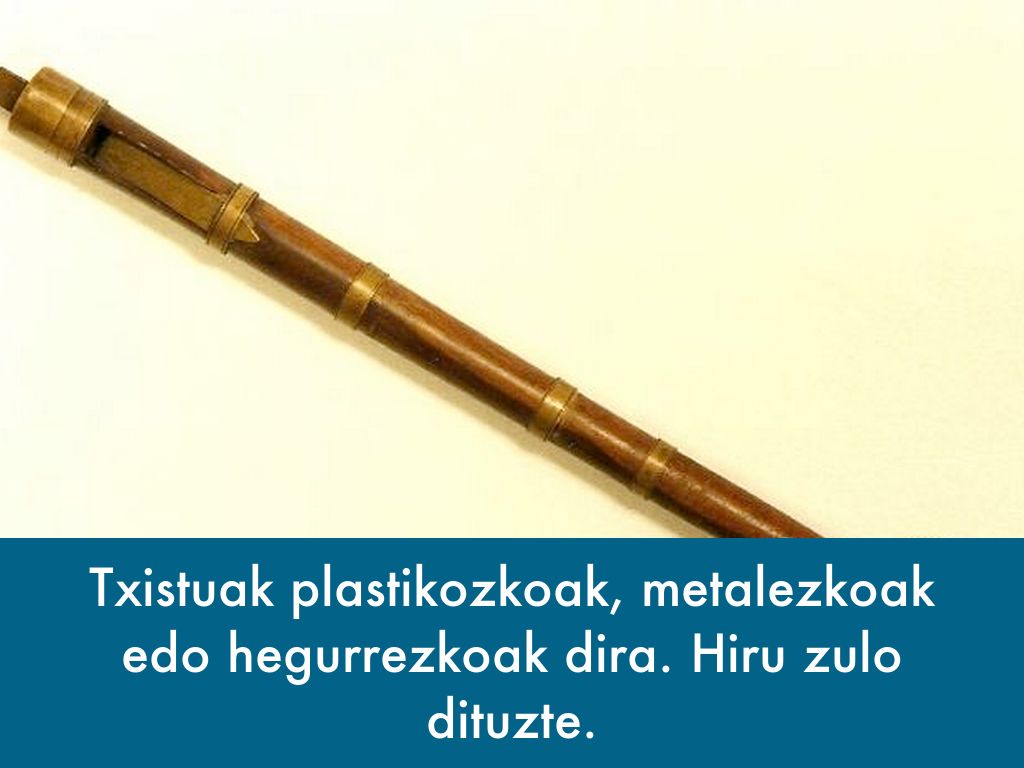 Txistuak plastikozkoak, metalezkoak edo hegurrezkoak dira. Hiru zulo dituzte.