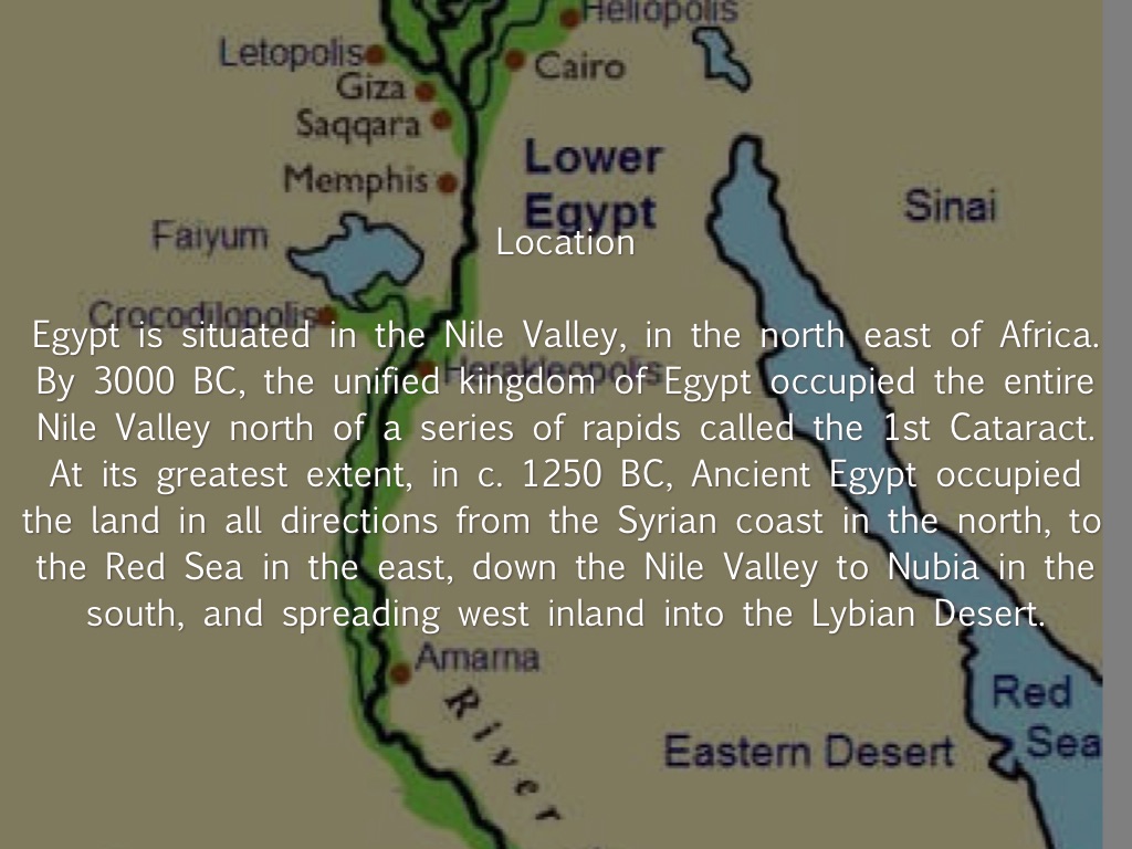 Egypt is situated in the Nile Valley, in the north east of Africa. By 3000 BC, the unified kingdom of Egypt occupied the entire Nile Valley north of a series of rapids called the 1st Cataract. At its greatest extent, in c. 1250 BC, Ancient Egypt occupied the land in all directions from the Syrian coast in the north, to the Red Sea in the east, down the Nile Valley to Nubia in the south, and spreading west inland into the Lybian Desert.