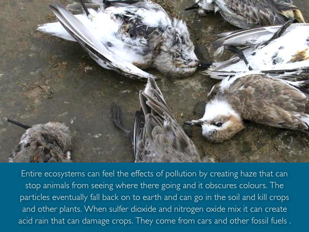 Entire ecosystems can feel the effects of pollution by creating haze that can stop animals from seeing where there going and it obscures colours. The particles eventually fall back on to earth and can go in the soil and kill crops and other plants. When sulfer dioxide and nitrogen oxide mix it can create acid rain that can damage crops. They come from cars and other fossil fuels .