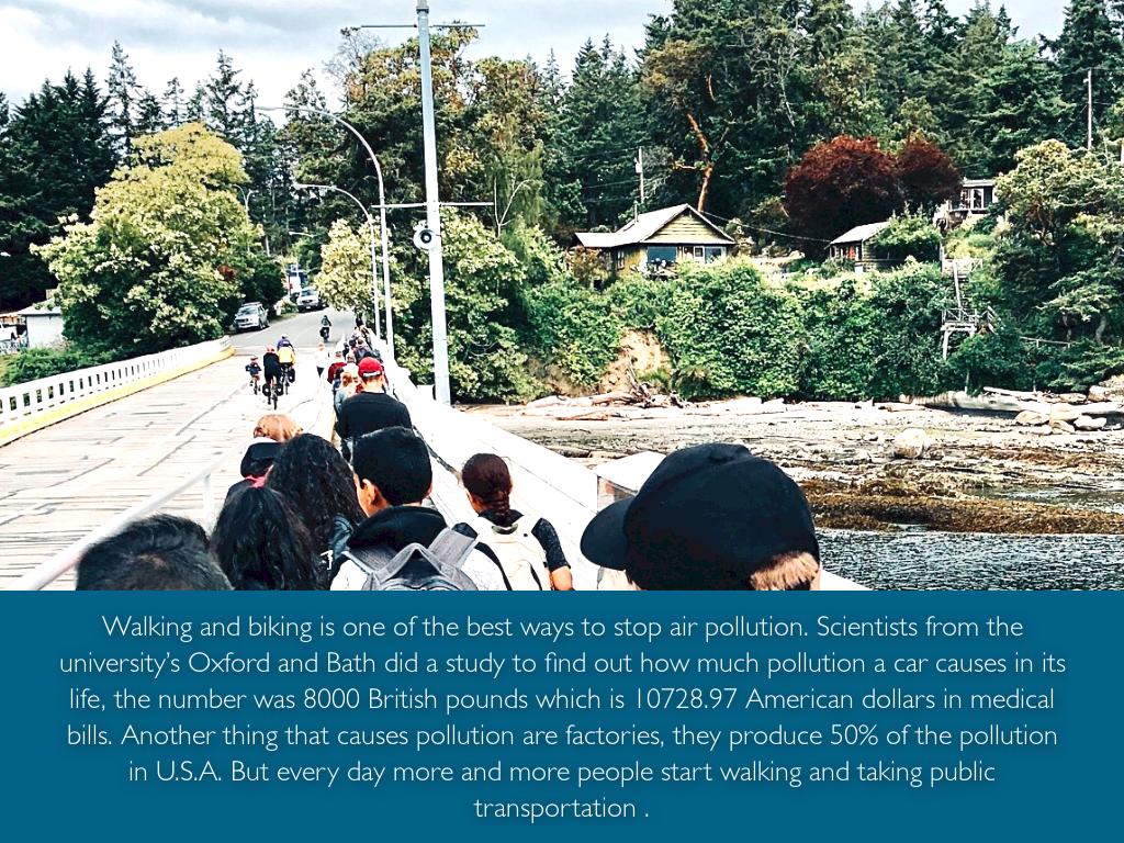 Walking and biking is one of the best ways to stop air pollution. Scientists from the university’s Oxford and Bath did a study to find out how much pollution a car causes in its life, the number was 8000 British pounds which is 10728.97 American dollars in medical bills. Another thing that causes pollution are factories, they produce 50% of the pollution in U.S.A. But every day more and more people start walking and taking public transportation .