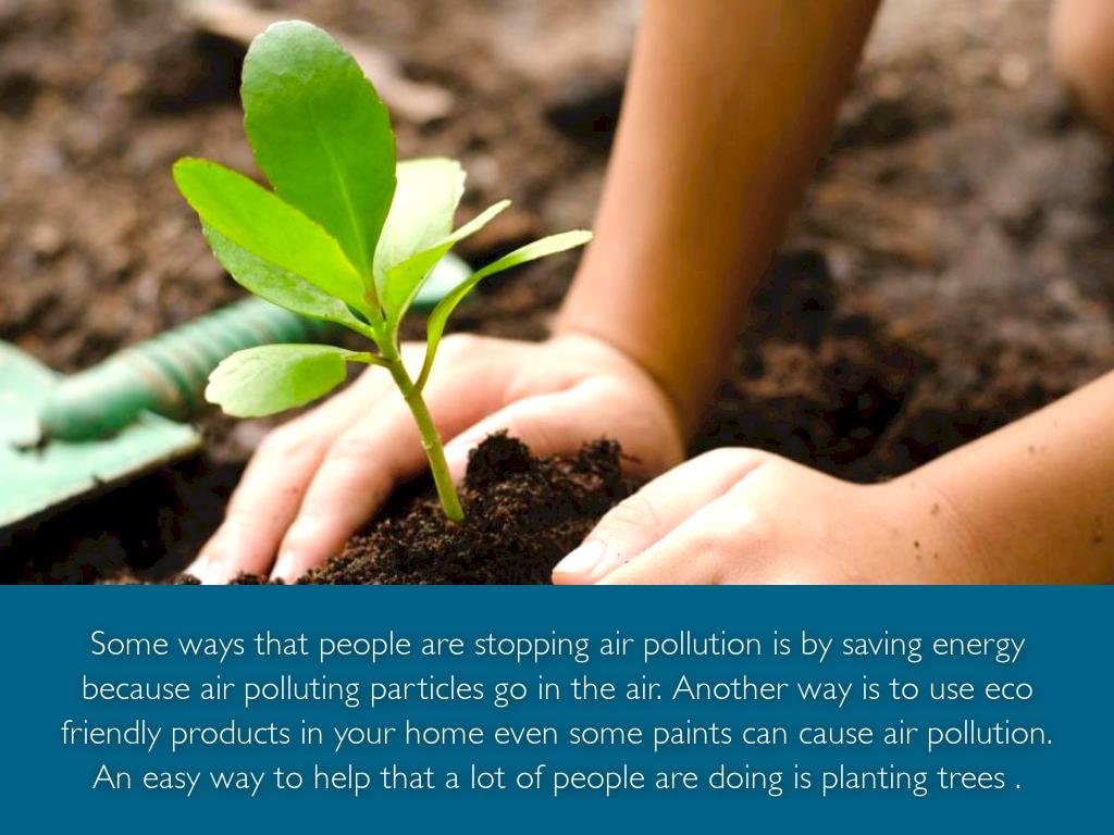 Some ways that people are stopping air pollution is by saving energy because air polluting particles go in the air. Another way is to use eco friendly products in your home even some paints can cause air pollution. An easy way to help that a lot of people are doing is planting trees .