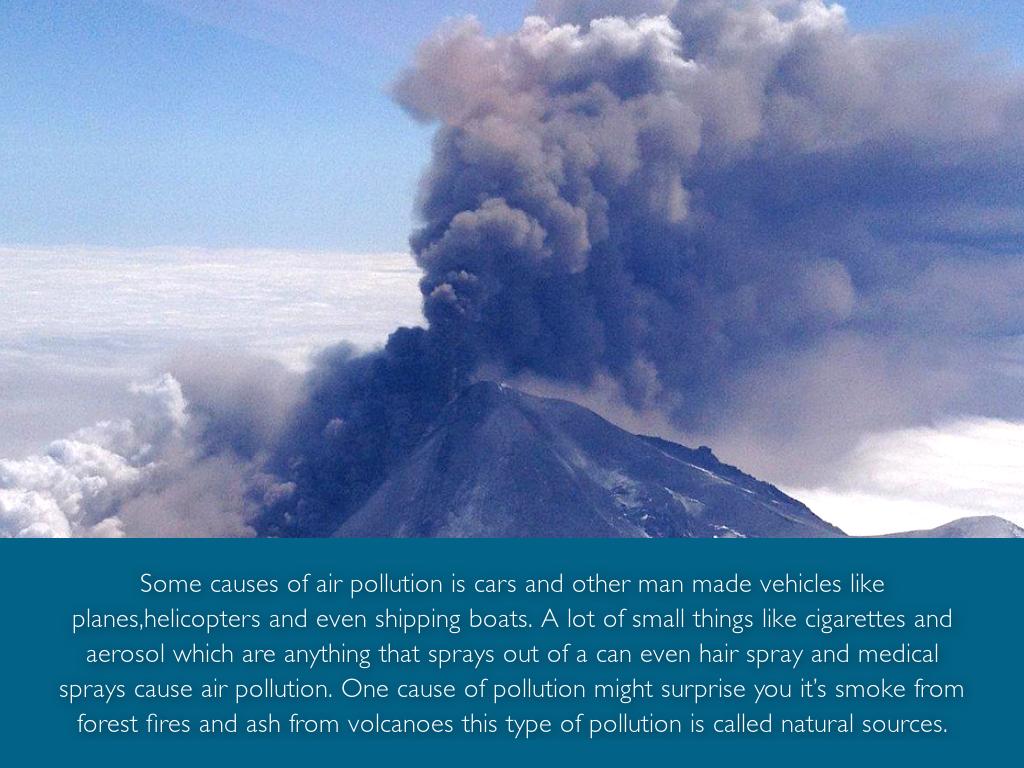 Some causes of air pollution is cars and other man made vehicles like planes,helicopters and even shipping boats. A lot of small things like cigarettes and aerosol which are anything that sprays out of a can even hair spray and medical sprays cause air pollution. One cause of pollution might surprise you it’s smoke from forest fires and ash from volcanoes this type of pollution is called natural sources.