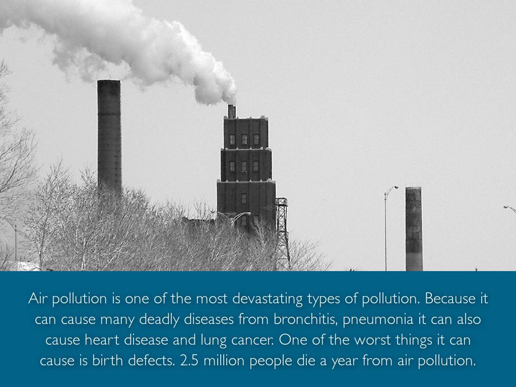 Air pollution is one of the most devastating types of pollution. Because it can cause many deadly diseases from bronchitis, pneumonia it can also cause heart disease and lung cancer. One of the worst things it can cause is birth defects. 2.5 million people die a year from air pollution.