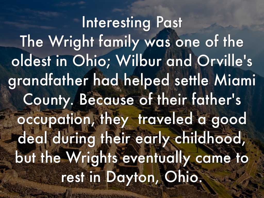 Interesting Past The Wright family was one of the oldest in Ohio; Wilbur and Orville's grandfather had helped settle Miami County. Because of their father's occupation, they traveled a good deal during their early childhood, but the Wrights eventually came to rest in Dayton, Ohio.