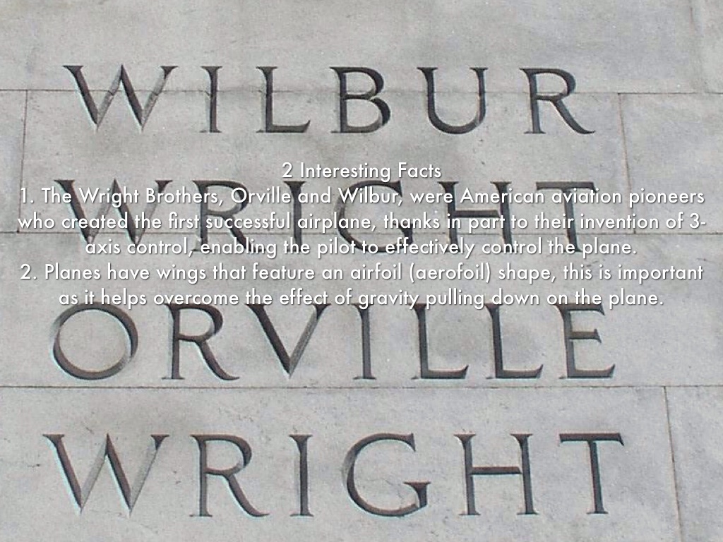 2 Interesting Facts 1. The Wright Brothers, Orville and Wilbur, were American aviation pioneers who created the first successful airplane, thanks in part to their invention of 3-axis control, enabling the pilot to effectively control the plane. 2. Planes have wings that feature an airfoil (aerofoil) shape, this is important as it helps overcome the effect of gravity pulling down on the plane.