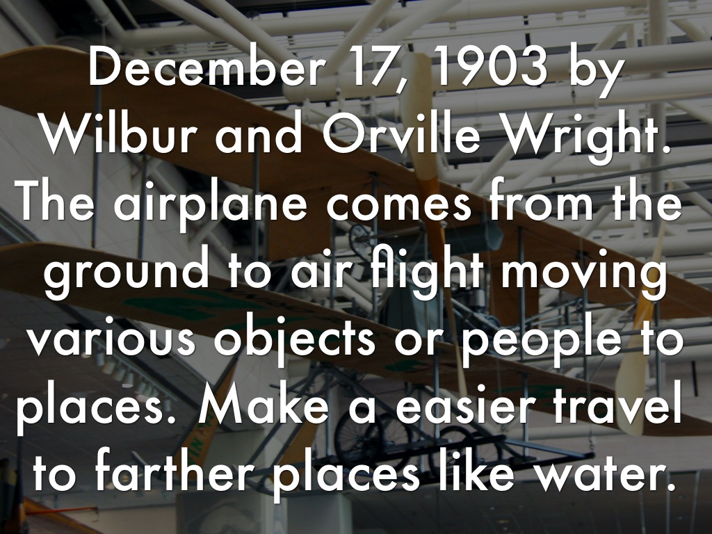 December 17, 1903 by Wilbur and Orville Wright. The airplane comes from the ground to air flight moving various objects or people to places. Make a easier travel to farther places like water.