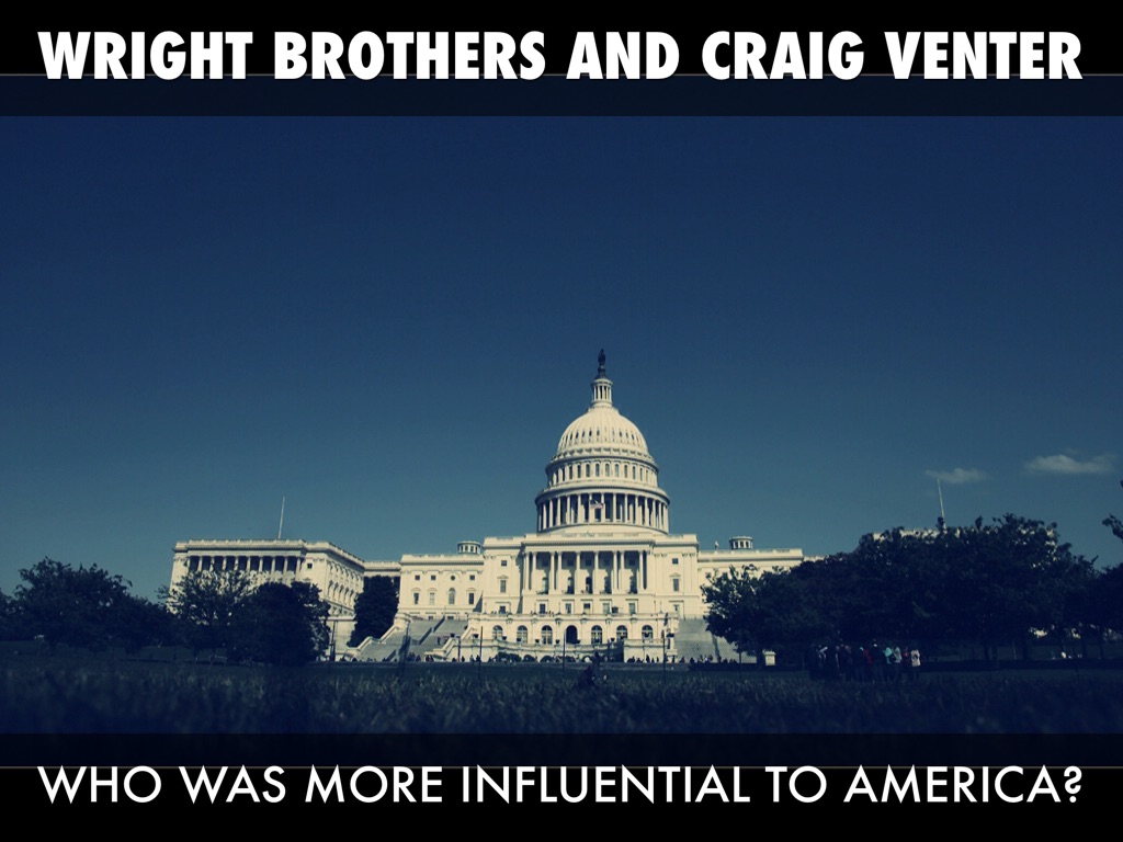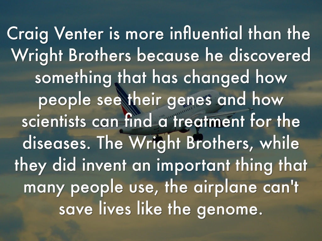 Craig Venter is more influential than the Wright Brothers because he discovered something that has changed how people see their genes and how scientists can find a treatment for the diseases. The Wright Brothers, while they did invent an important thing that many people use, the airplane can't save lives like the genome.