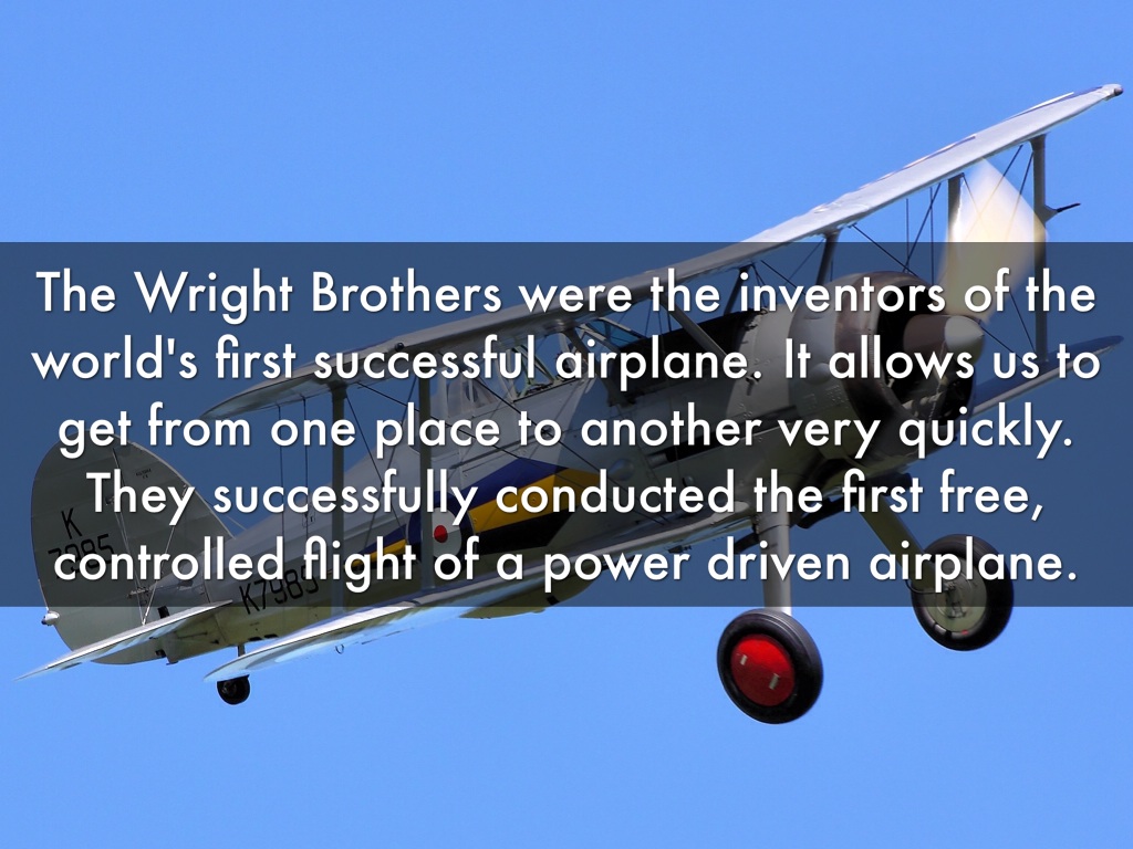 The Wright Brothers were the inventors of the world's first successful airplane. It allows us to get from one place to another very quickly. They successfully conducted the first free, controlled flight of a power driven airplane.