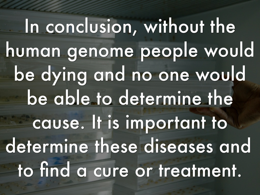 In conclusion, without the human genome people would be dying and no one would be able to determine the cause. It is important to determine these diseases and to find a cure or treatment.