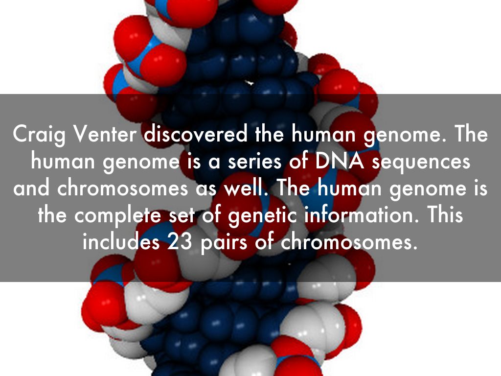 Craig Venter discovered the human genome. The human genome is a series of DNA sequences and chromosomes as well. The human genome is the complete set of genetic information. This includes 23 pairs of chromosomes.