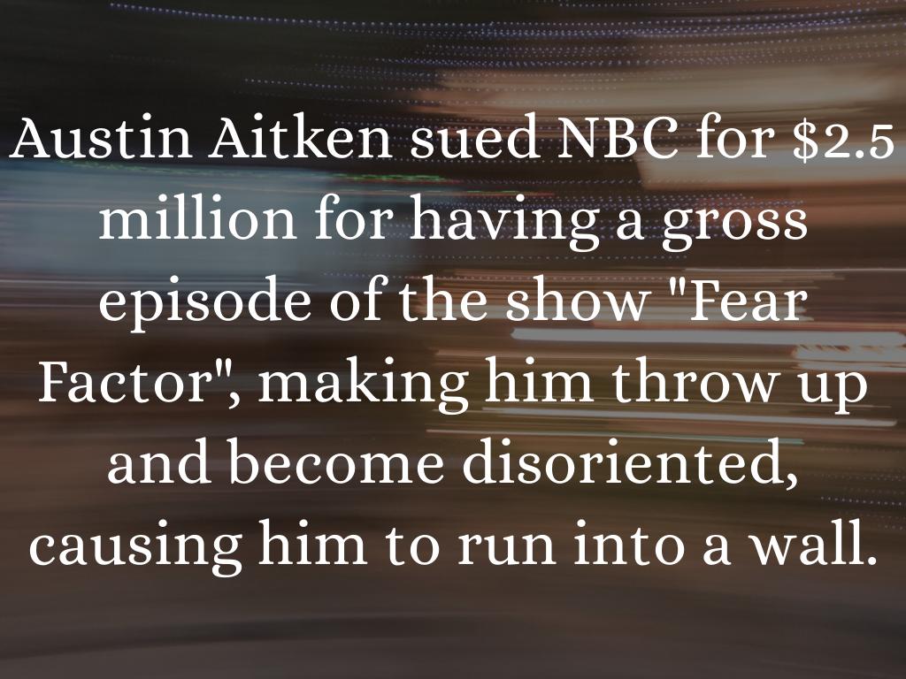 Austin Aitken sued NBC for $2.5 million for having a gross episode of the show "Fear Factor", making him throw up and become disoriented, causing him to run into a wall.