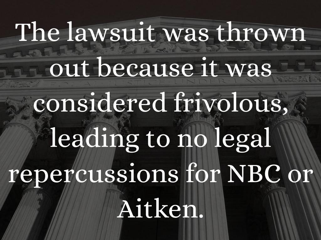 The lawsuit was thrown out because it was considered frivolous, leading to no legal repercussions for NBC or Aitken.