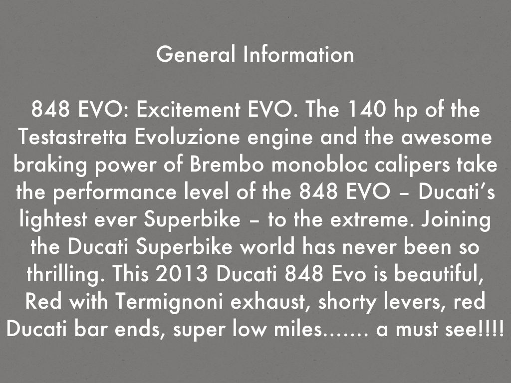 848 EVO: Excitement EVO. The 140 hp of the Testastretta Evoluzione engine and the awesome braking power of Brembo monobloc calipers take the performance level of the 848 EVO – Ducati’s lightest ever Superbike – to the extreme. Joining the Ducati Superbike world has never been so thrilling. This 2013 Ducati 848 Evo is beautiful, Red with Termignoni exhaust, shorty levers, red Ducati bar ends, super low miles……. a must see!!!!