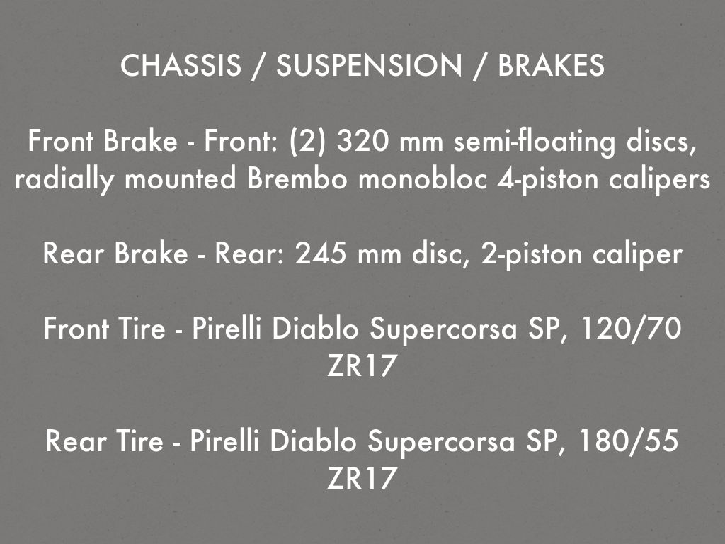 Front Brake - Front: (2) 320 mm semi-floating discs, radially mounted Brembo monobloc 4-piston calipers
