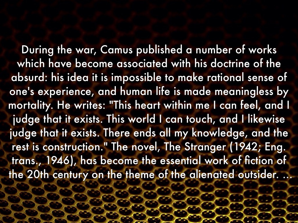During the war, Camus published a number of works which have become associated with his doctrine of the absurd: his idea it is impossible to make rational sense of one's experience, and human life is made meaningless by mortality. He writes: "This heart within me I can feel, and I judge that it exists. This world I can touch, and I likewise judge that it exists. There ends all my knowledge, and the rest is construction." The novel, The Stranger (1942; Eng. trans., 1946), has become the essential work of fiction of the 20th century on the theme of the alienated outsider.
