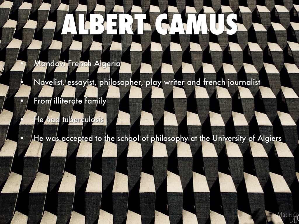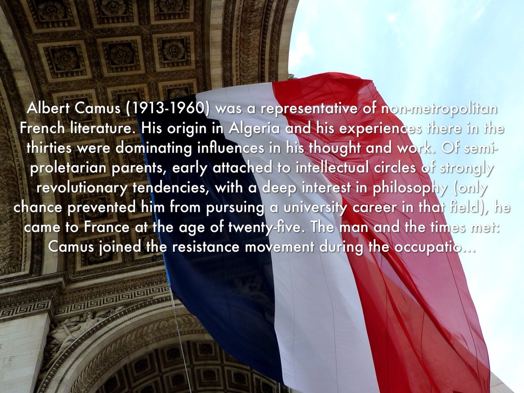 Albert Camus (1913-1960) was a representative of non-metropolitan French literature. His origin in Algeria and his experiences there in the thirties were dominating influences in his thought and work. Of semi-proletarian parents, early attached to intellectual circles of strongly revolutionary tendencies, with a deep interest in philosophy (only chance prevented him from pursuing a university career in that field), he came to France at the age of twenty-five. The man and the times met: Camus joined the resistance movement during the occupatio