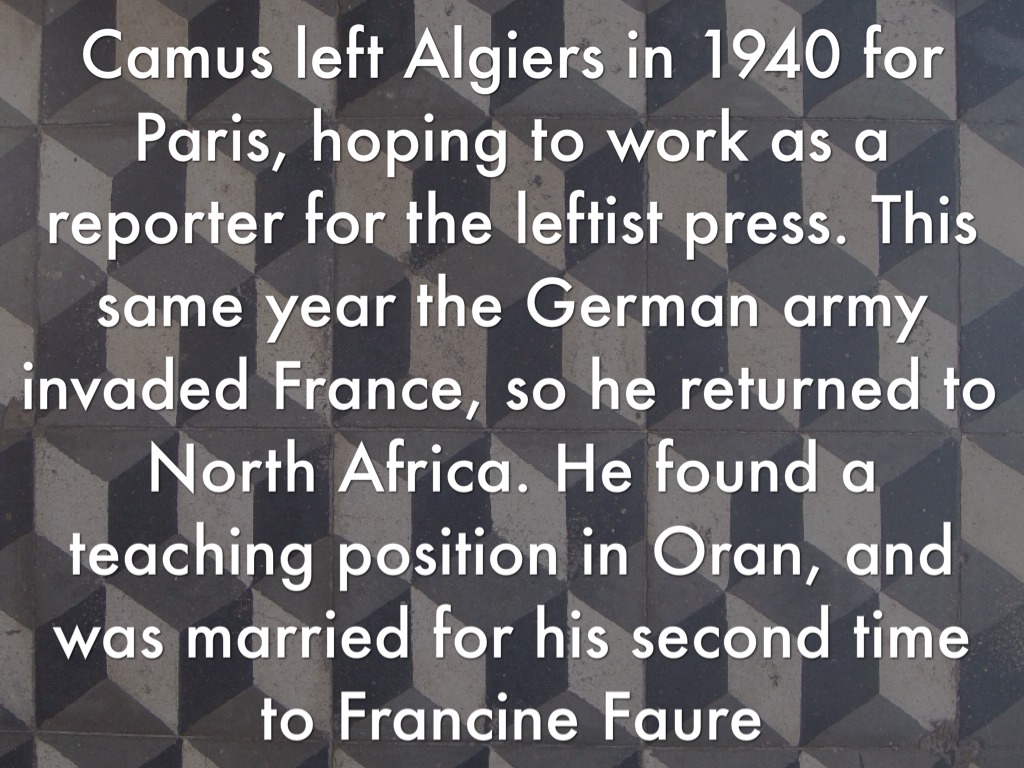 Camus left Algiers in 1940 for Paris, hoping to work as a reporter for the leftist press. This same year the German army invaded France, so he returned to North Africa. He found a teaching position in Oran, and was married for his second time to Francine Faure