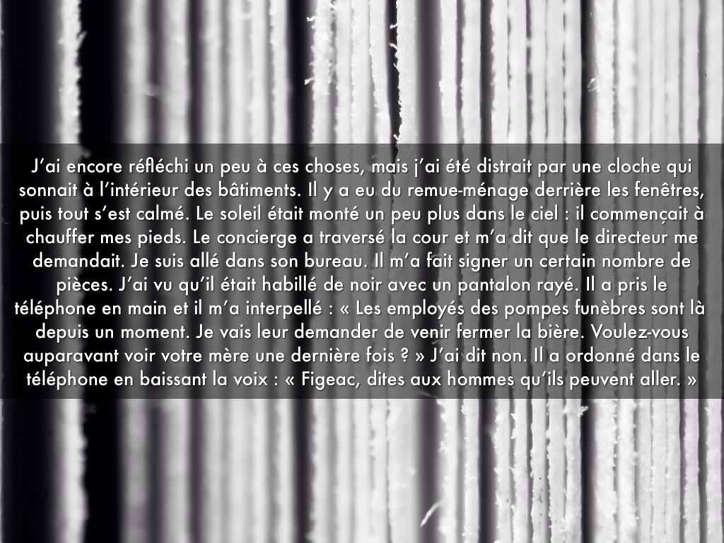J’ai encore réfléchi un peu à ces choses, mais j’ai été distrait par une cloche qui sonnait à l’intérieur des bâtiments. Il y a eu du remue-ménage derrière les fenêtres, puis tout s’est calmé. Le soleil était monté un peu plus dans le ciel : il commençait à chauffer mes pieds. Le concierge a traversé la cour et m’a dit que le directeur me demandait. Je suis allé dans son bureau. Il m’a fait signer un certain nombre de pièces. J’ai vu qu’il était habillé de noir avec un pantalon rayé. Il a pris le téléphone en main et il m’a interpellé : « Les employés des pompes funèbres sont là depuis un moment. Je vais leur demander de venir fermer la bière. Voulez-vous auparavant voir votre mère une dernière fois ? » J’ai dit non. Il a ordonné dans le téléphone en baissant la voix : « Figeac, dites aux hommes qu’ils peuvent aller. »
