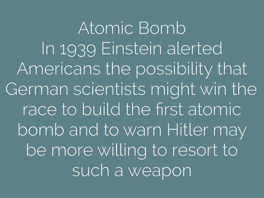 In 1939 Einstein alerted Americans the possibility that German scientists might win the race to build the first atomic bomb and to warn Hitler may be more willing to resort to such a weapon