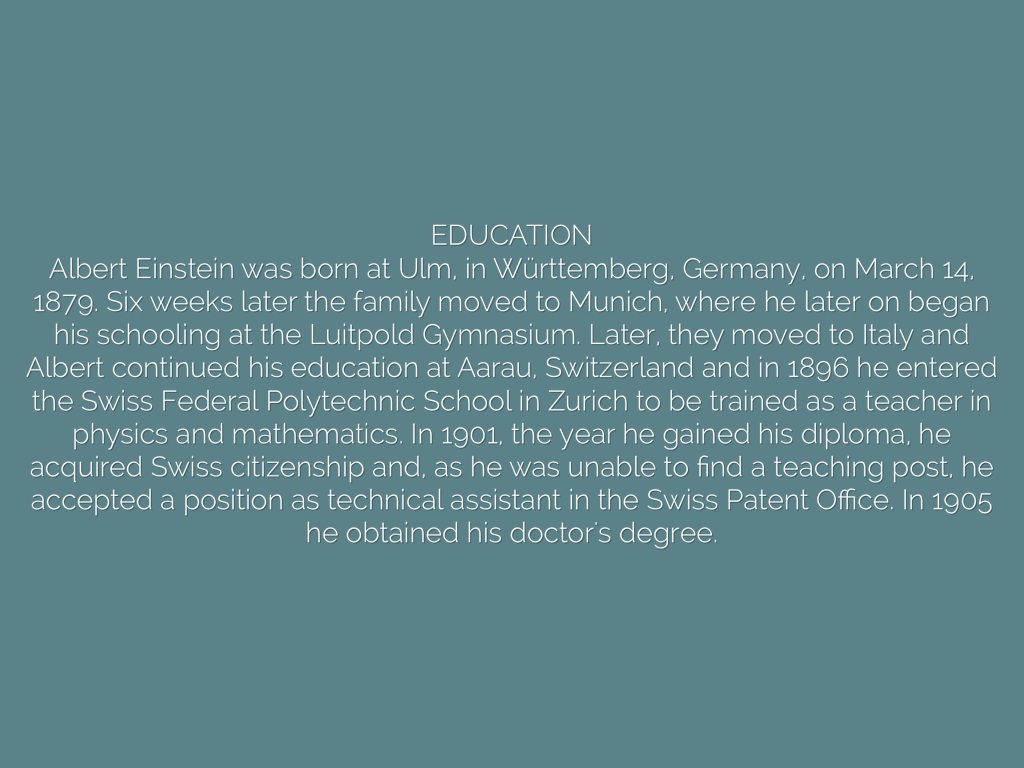 Albert Einstein was born at Ulm, in Württemberg, Germany, on March 14, 1879. Six weeks later the family moved to Munich, where he later on began his schooling at the Luitpold Gymnasium. Later, they moved to Italy and Albert continued his education at Aarau, Switzerland and in 1896 he entered the Swiss Federal Polytechnic School in Zurich to be trained as a teacher in physics and mathematics. In 1901, the year he gained his diploma, he acquired Swiss citizenship and, as he was unable to find a teaching post, he accepted a position as technical assistant in the Swiss Patent Office. In 1905 he obtained his doctor's degree.