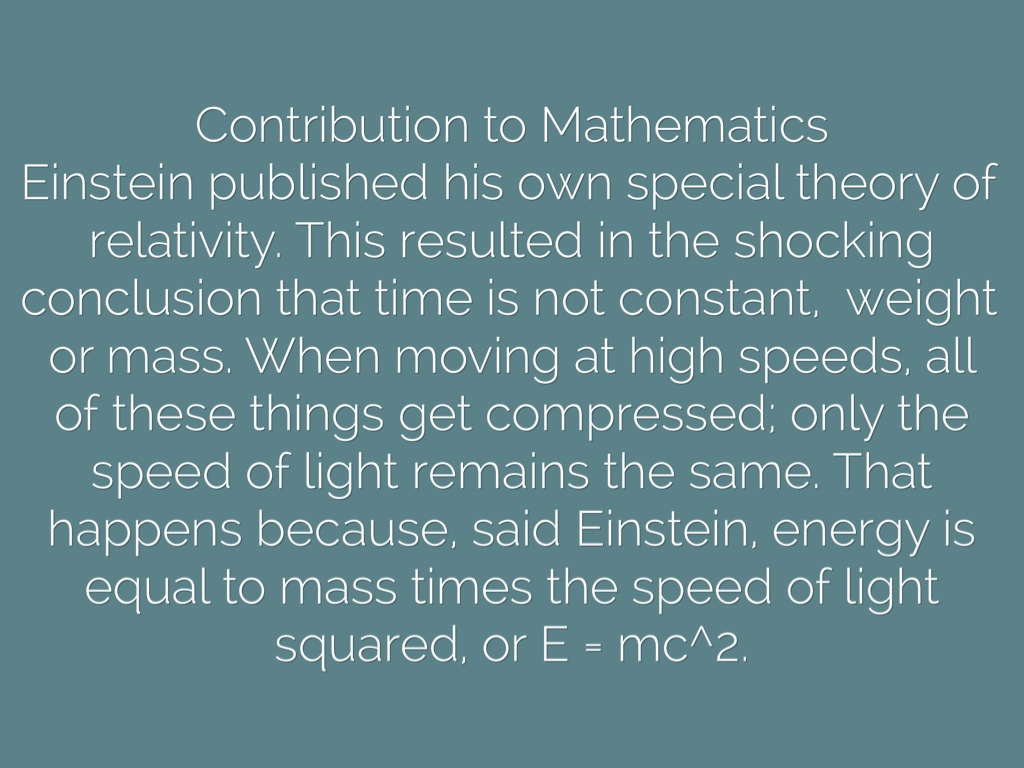 Einstein published his own special theory of relativity. This resulted in the shocking conclusion that time is not constant, weight or mass. When moving at high speeds, all of these things get compressed; only the speed of light remains the same. That happens because, said Einstein, energy is equal to mass times the speed of light squared, or E = mc^2.