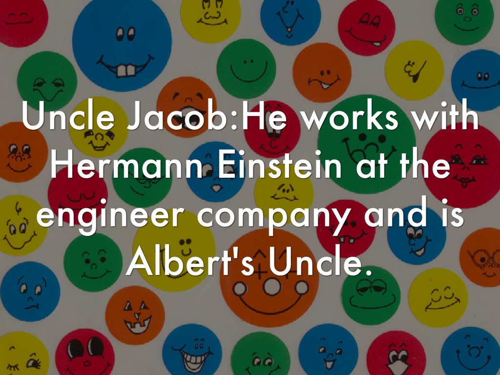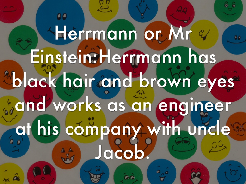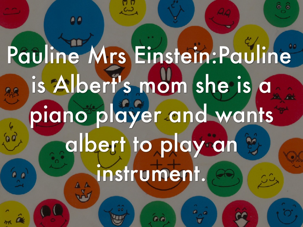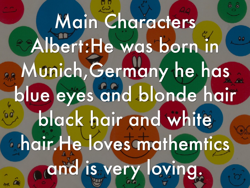 Main Characters Albert:He was born in Munich,Germany he has blue eyes and blonde hair black hair and white hair.He loves mathemtics and is very loving.