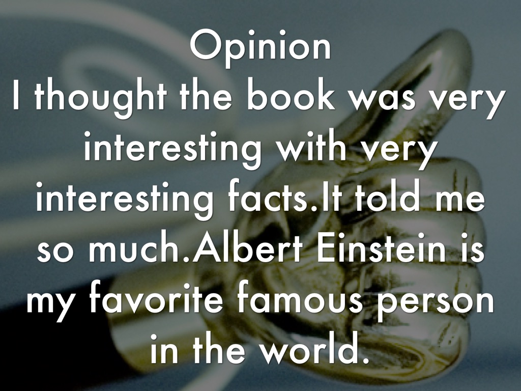Opinion I thought the book was very interesting with very interesting facts.It told me so much.Albert Einstein is my favorite famous person in the world.