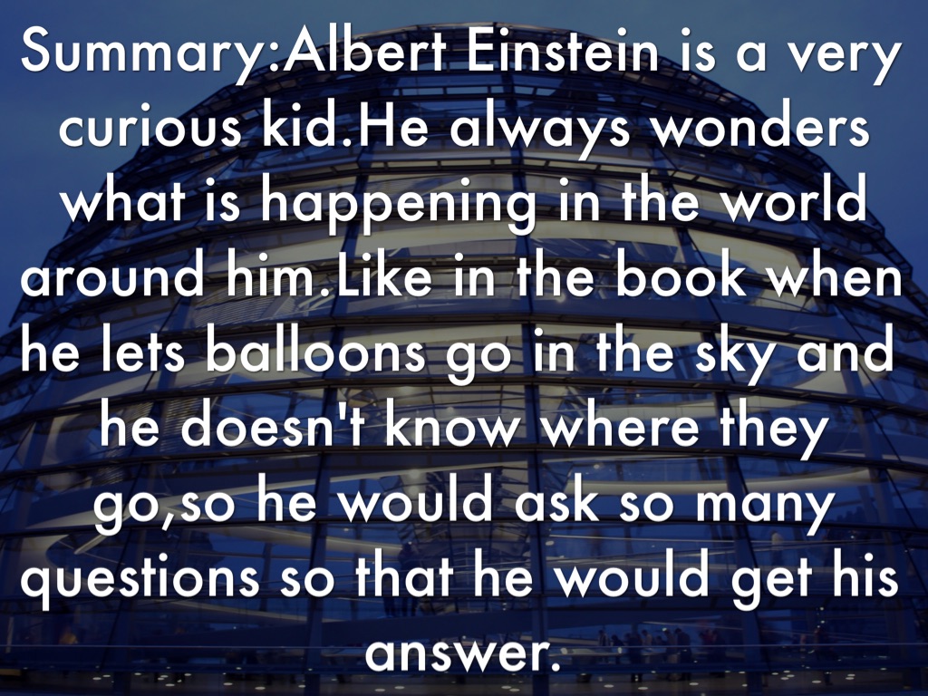 Summary:Albert Einstein is a very curious kid.He always wonders what is happening in the world around him.Like in the book when he lets balloons go in the sky and he doesn't know where they go,so he would ask so many questions so that he would get his answer.