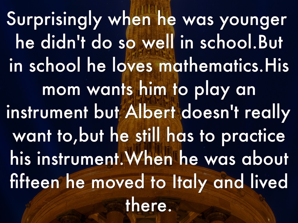 Surprisingly when he was younger he didn't do so well in school.But in school he loves mathematics.His mom wants him to play an instrument but Albert doesn't really want to,but he still has to practice his instrument.When he was about fifteen he moved to Italy and lived there.