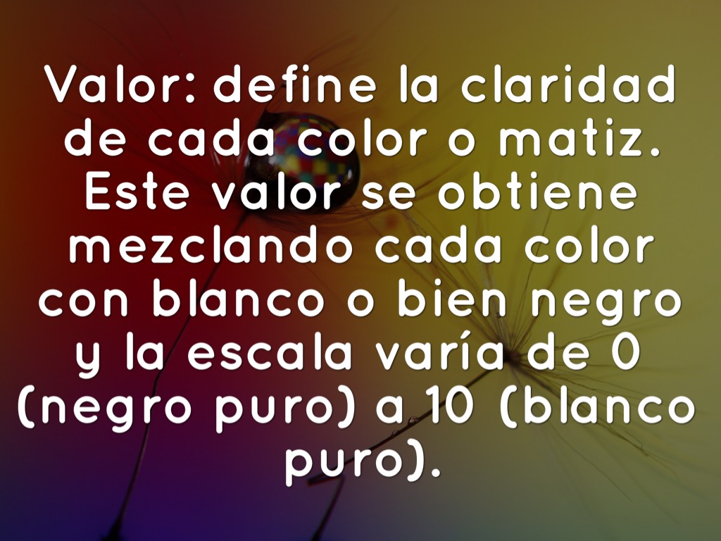 Valor: define la claridad de cada color o matiz. Este valor se obtiene mezclando cada color con blanco o bien negro y la escala varía de 0 (negro puro) a 10 (blanco puro).