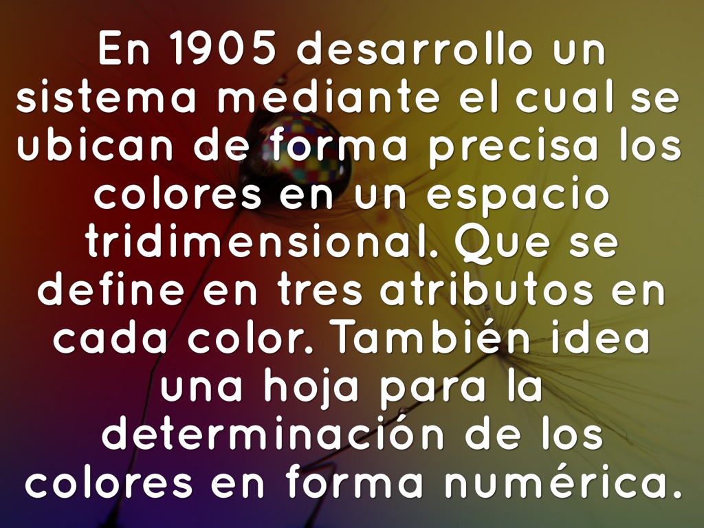 En 1905 desarrollo un sistema mediante el cual se ubican de forma precisa los colores en un espacio tridimensional. Que se define en tres atributos en cada color. También idea una hoja para la determinación de los colores en forma numérica.